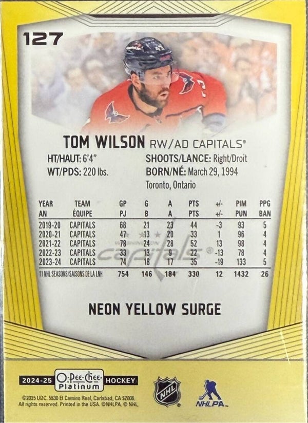The Tom Wilson #127 O-Pee-Chee trading card is a must-have for collectors, featuring high-quality design and showcasing the player's stats and achievements. Perfect for hockey enthusiasts and trading card fans alike.