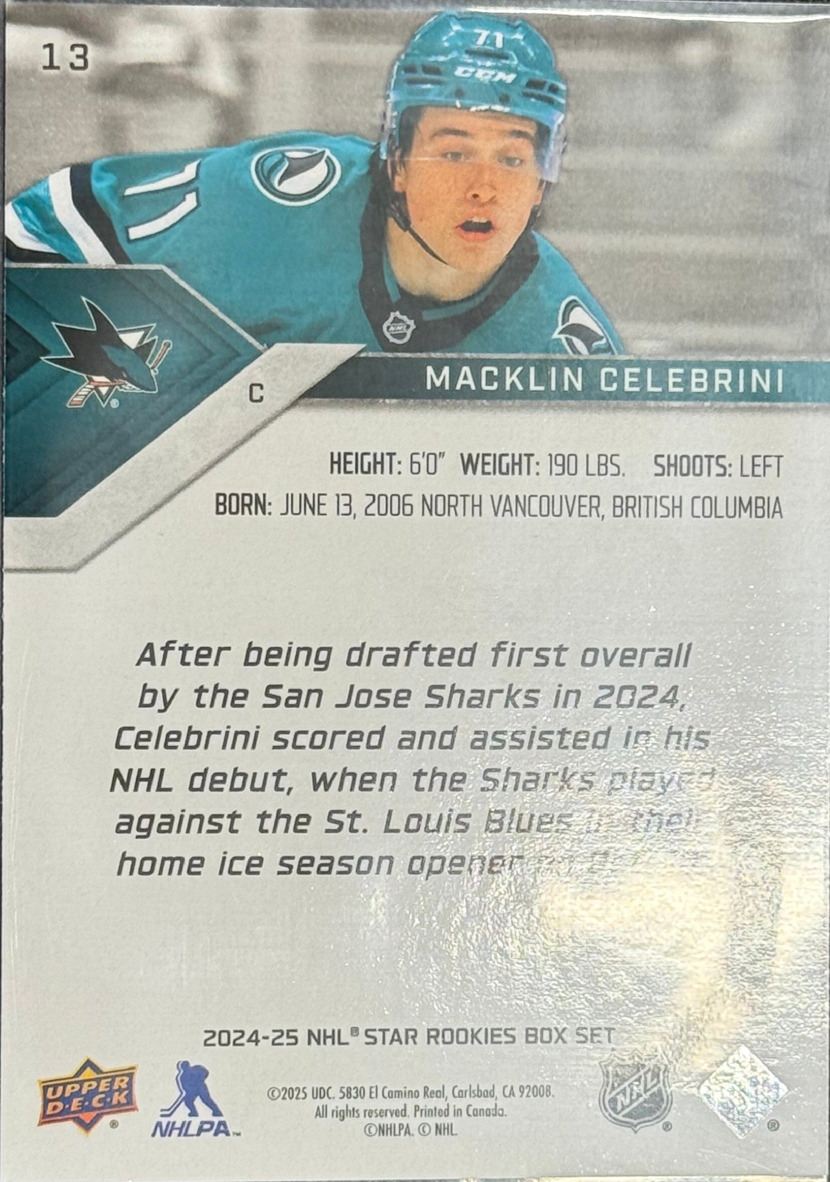 The Upper Deck Macklin Celebrini #13 Star Rookies card showcases the promising young talent from San Jose. A must-have collectible for hockey enthusiasts and trading card collectors alike.