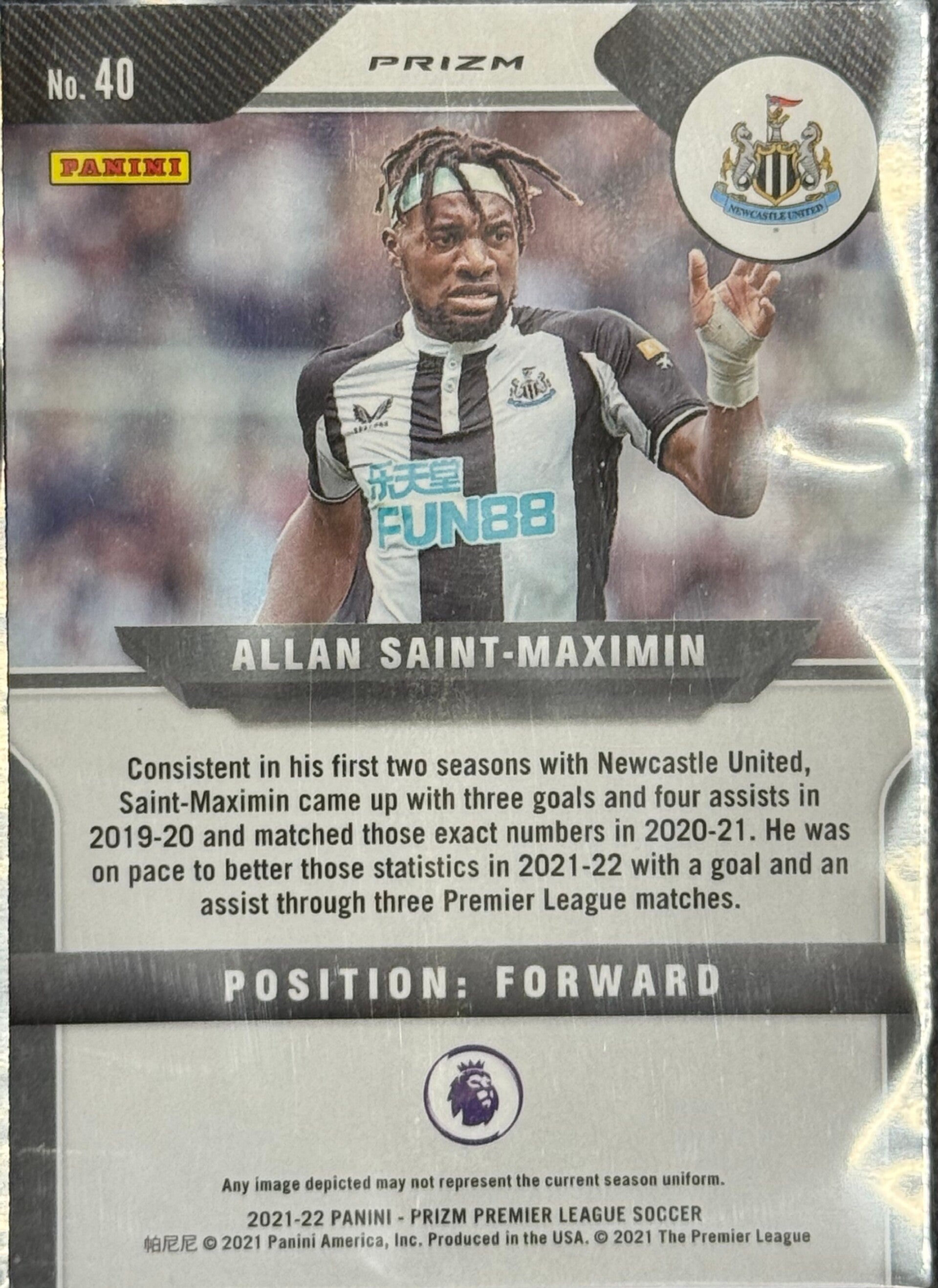 This Allan Saint-Maximin No.40 Prizm card celebrates the dynamic Newcastle United player with vibrant detailing and quality craftsmanship. A must-have for football card collectors and fans of Saint-Maximin.