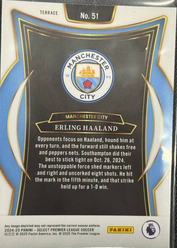 The Panini Select Erling Haaland No. 51 card features the Manchester City striker in high-quality detail, ideal for collectors and football enthusiasts. A must-have addition to any Panini collection celebrating one of football's standout talents.