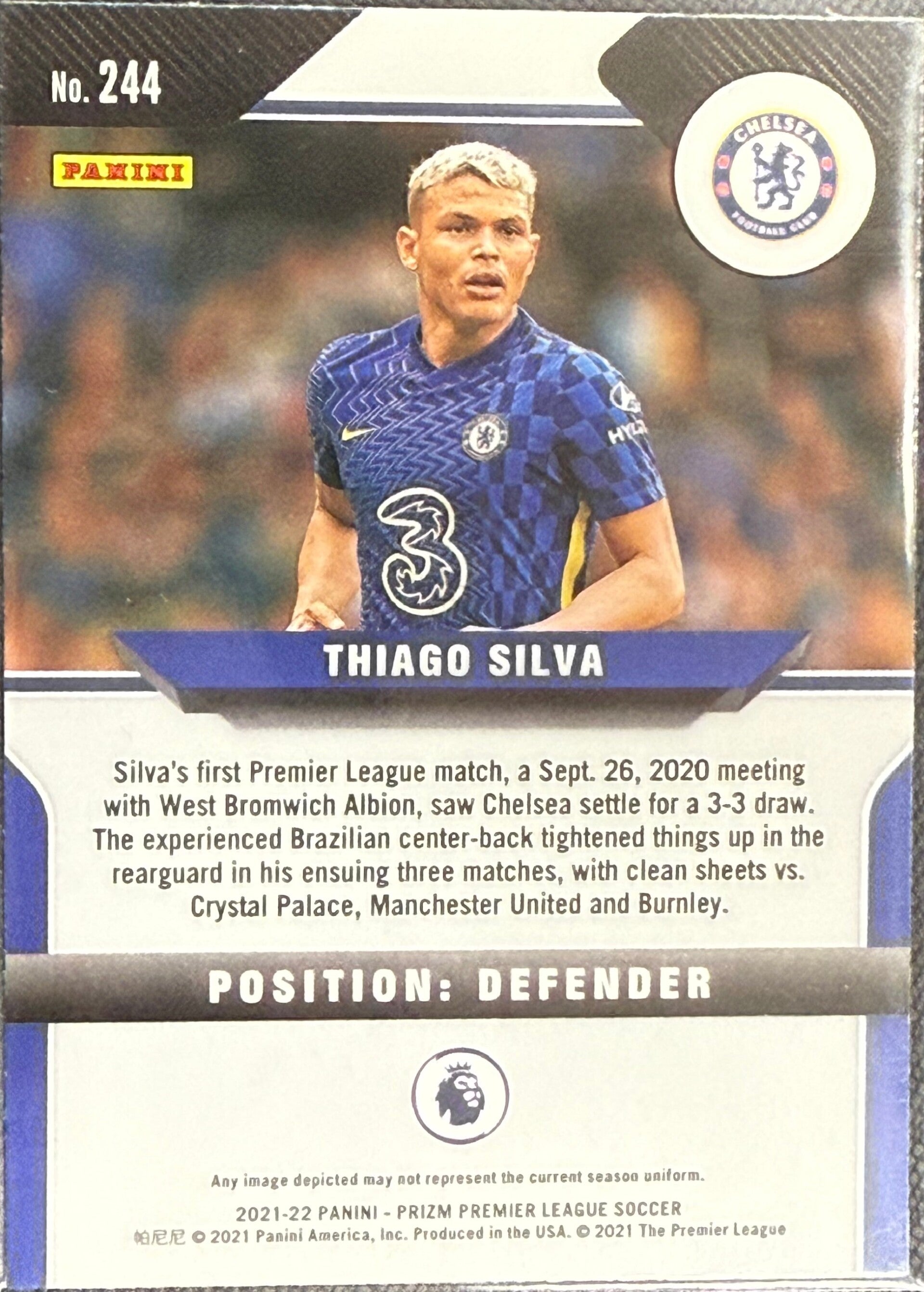 Thiago Silva - No. 244 Panini Prizm card is a premium collectible featuring the Chelsea defender in stunning detail. Ideal for football fans and card enthusiasts, this officially licensed card is a must-have addition to any collection.